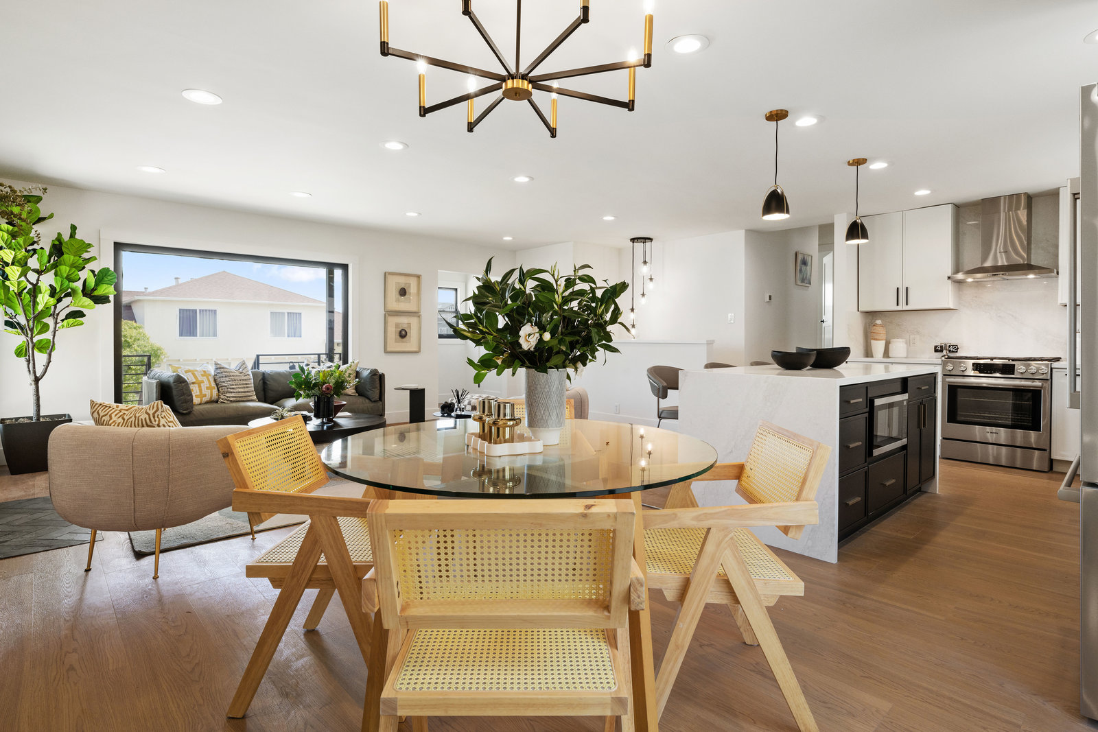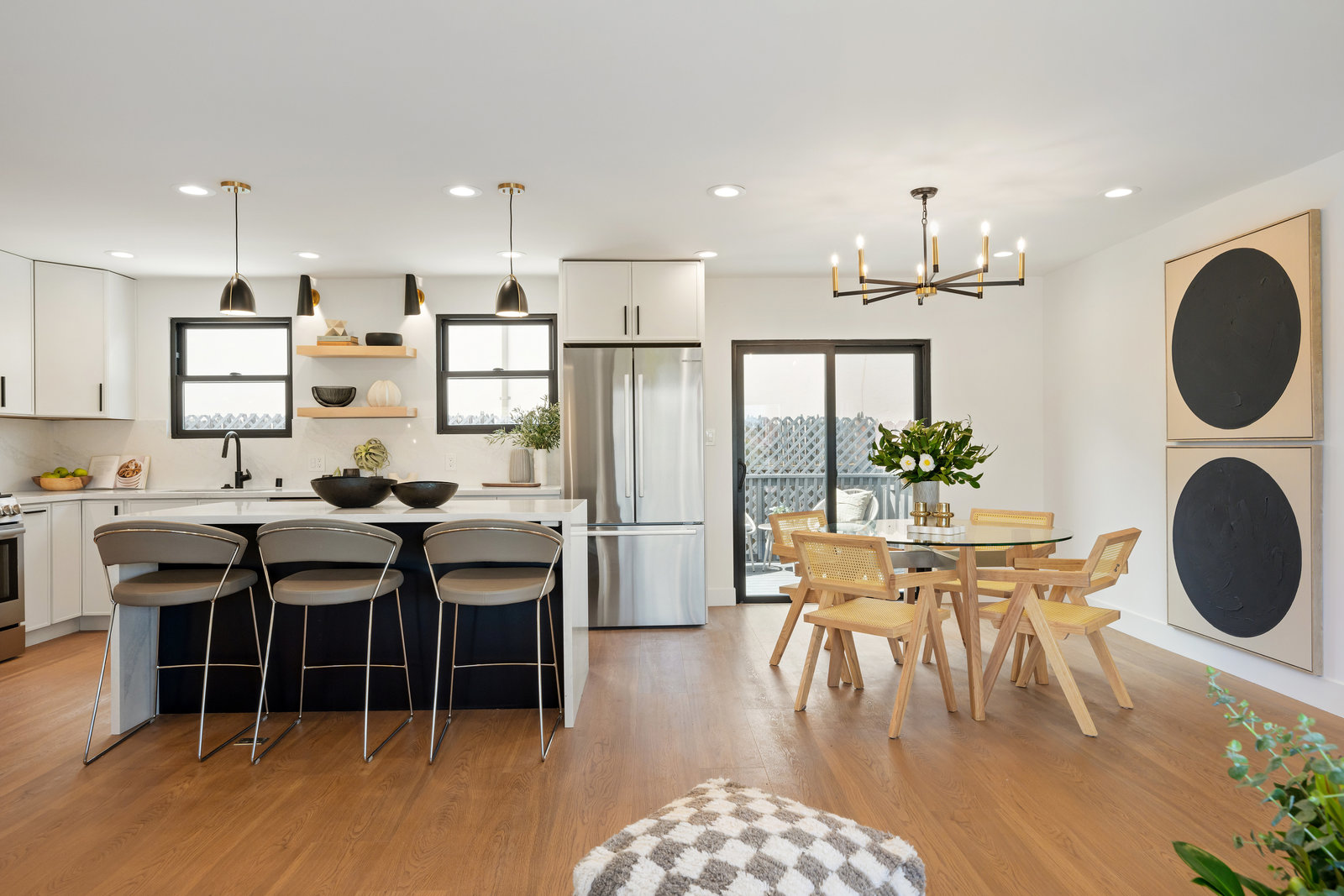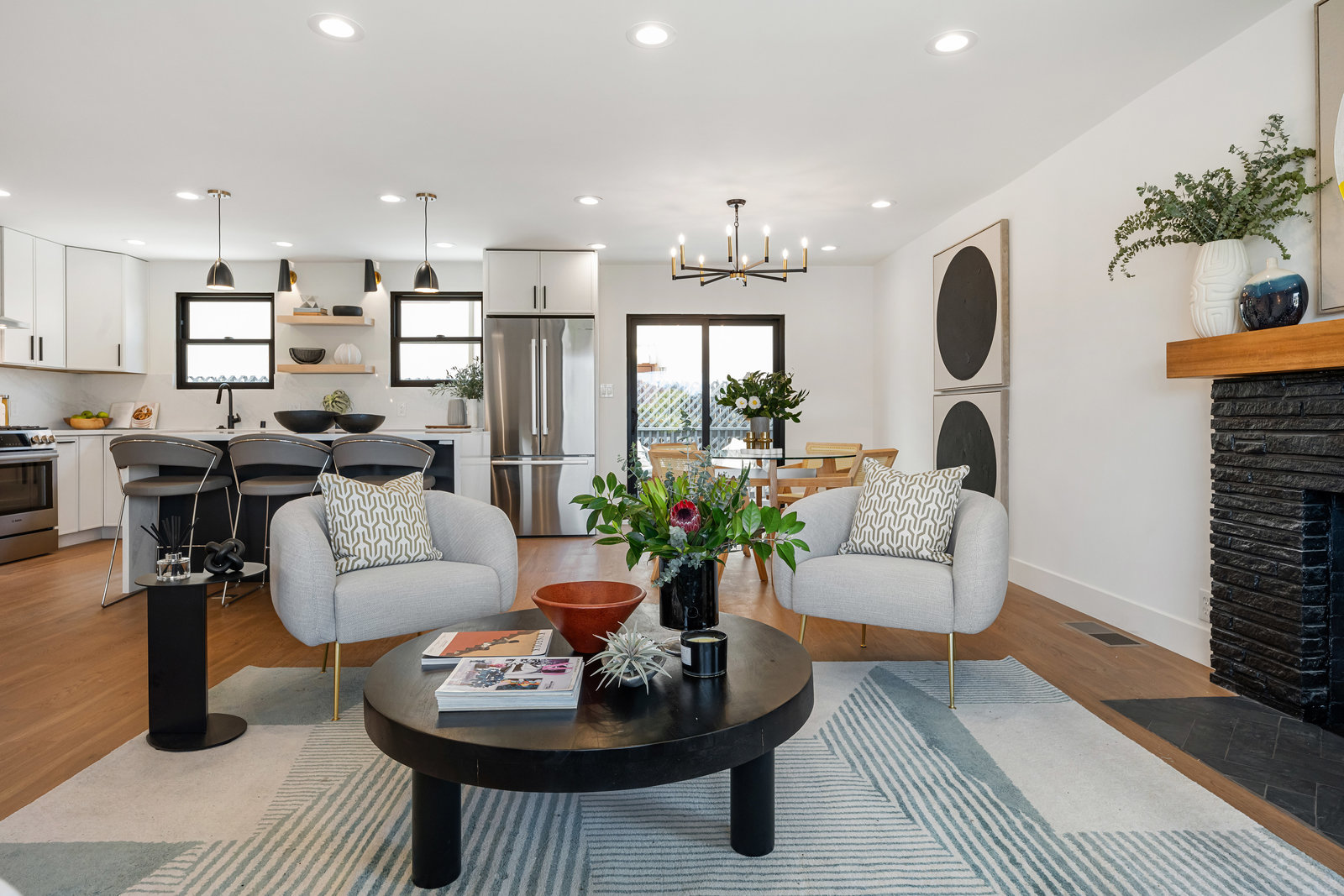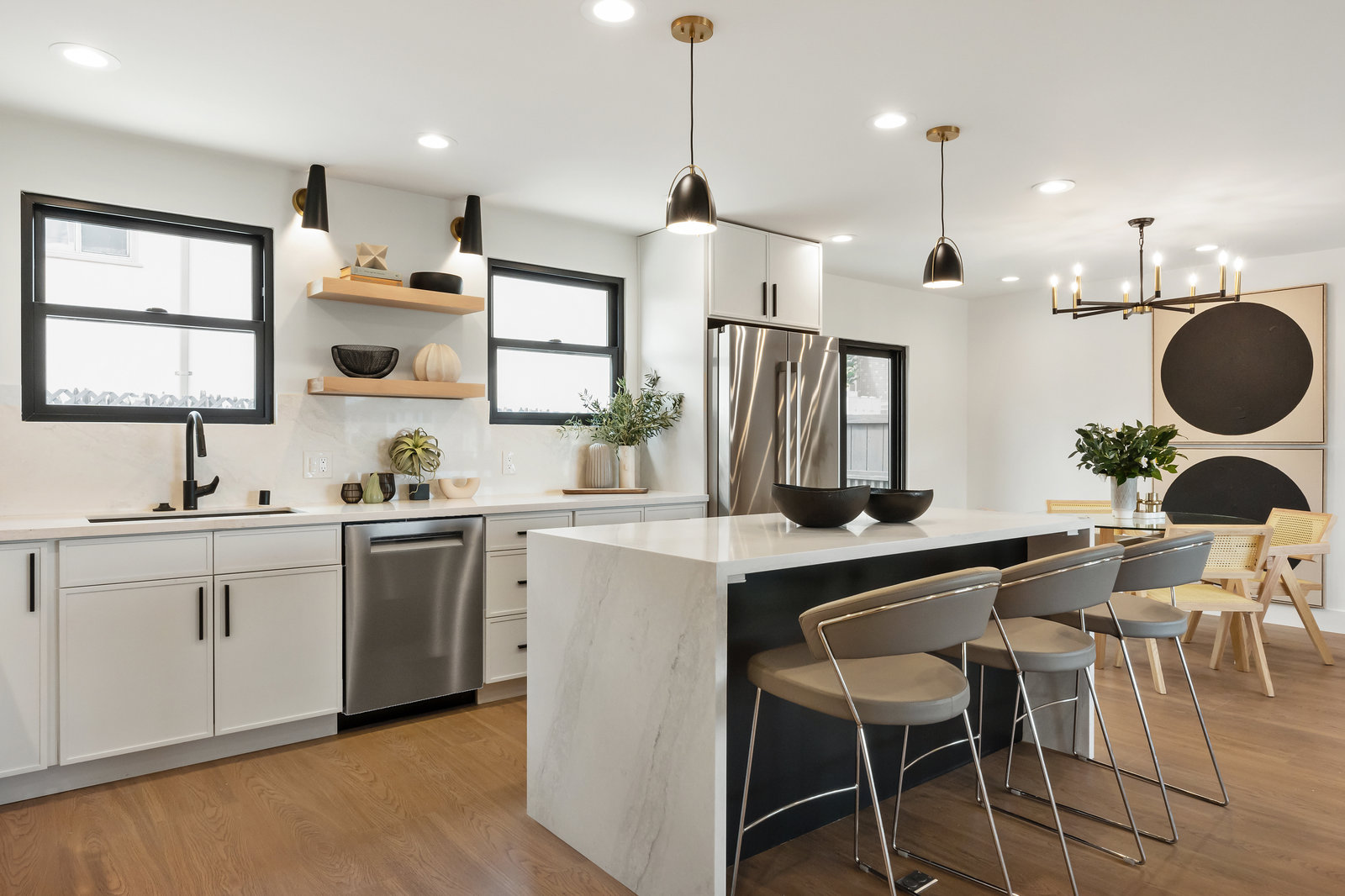 Step into the show-stopping kitchen, where a custom waterfall island and top-of-the-line Bosch appliances make every meal a pleasure. Designer finishes and new custom windows flood the home with natural light, creating a warm and inviting ambiance throughout.